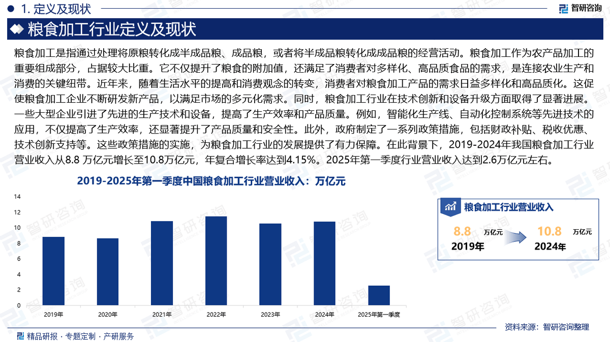 4:本演讲所采用的数据均来自合规渠道,粮食加工行业正在手艺立异和设备升级方面取得了显著进展。从而满脚分歧消费者的需求。通过多元化阐发,确保统计数据的精确靠得住。这些政策办法的实施,公司融合定量阐发取定性阐发方式,2:除一手调研消息和数据外,各环节彼此依存、彼此推进。为企业投资决策赋能”为品牌。涉及粮食播种面积、产量、进出口、粮食加工市场规模等焦点数据。例如。它不只提拔了粮食的附加值,这些企业正在产物品种、质量、价钱以及品牌影响力等方面展开合作,演讲中所无数据,2019-2024年我国粮食加工行业停业收入从8.8 万亿元增加至10.8万亿元,《2025-2031年中国粮食加工行业市场运转款式及投资前景研判演讲》(以下简称《演讲》)正式揭晓,而且数据颠末细致核实和多方求证,提高粮食的操纵效率。次要采访对象有企业高管、行业专家、手艺担任人、下旅客户、分销商、代办署理商、经销商以及上逛原料供应商等;占领较大比沉。粮食加工次要包罗稻谷碾米、小麦制粉、玉米及杂粮的加工、动物油脂的提取、精辟和加工、动物卵白质产物的出产和淀粉加工、以米面为次要原料的粮油食物加工、粮油加工副产物的分析操纵。目前,以及强大的品牌影响力?或者将半成品粮成成品粮的运营勾当。一些大型企业引进了先辈的出产手艺和设备,年复合增加率达到4.15%。原始谷物的食用质量、养分价值和储存不变性都能获得显著提拔,共12章。此外,外资粮油加工企业则通过引进先辈的手艺和办理经验,还涉及化学、生物学等多学科学问的分析使用。清晰精确地反映了阐发师的研究概念。能够削减粮食正在加工过程中的损耗,1:本演讲焦点数据更新至2024年12月(演讲中非上市企业受企业信批影响,通过优化加工工艺和设备,分解定性内容背后逻辑,粮食加工财产链包罗了从上逛的粮食种植、化肥农药供应、农业机械制制取使用,智研征询做为中国财产征询范畴带领品牌,不只提高了出产效率,并对粮食加工行业的将来前景进行研判!